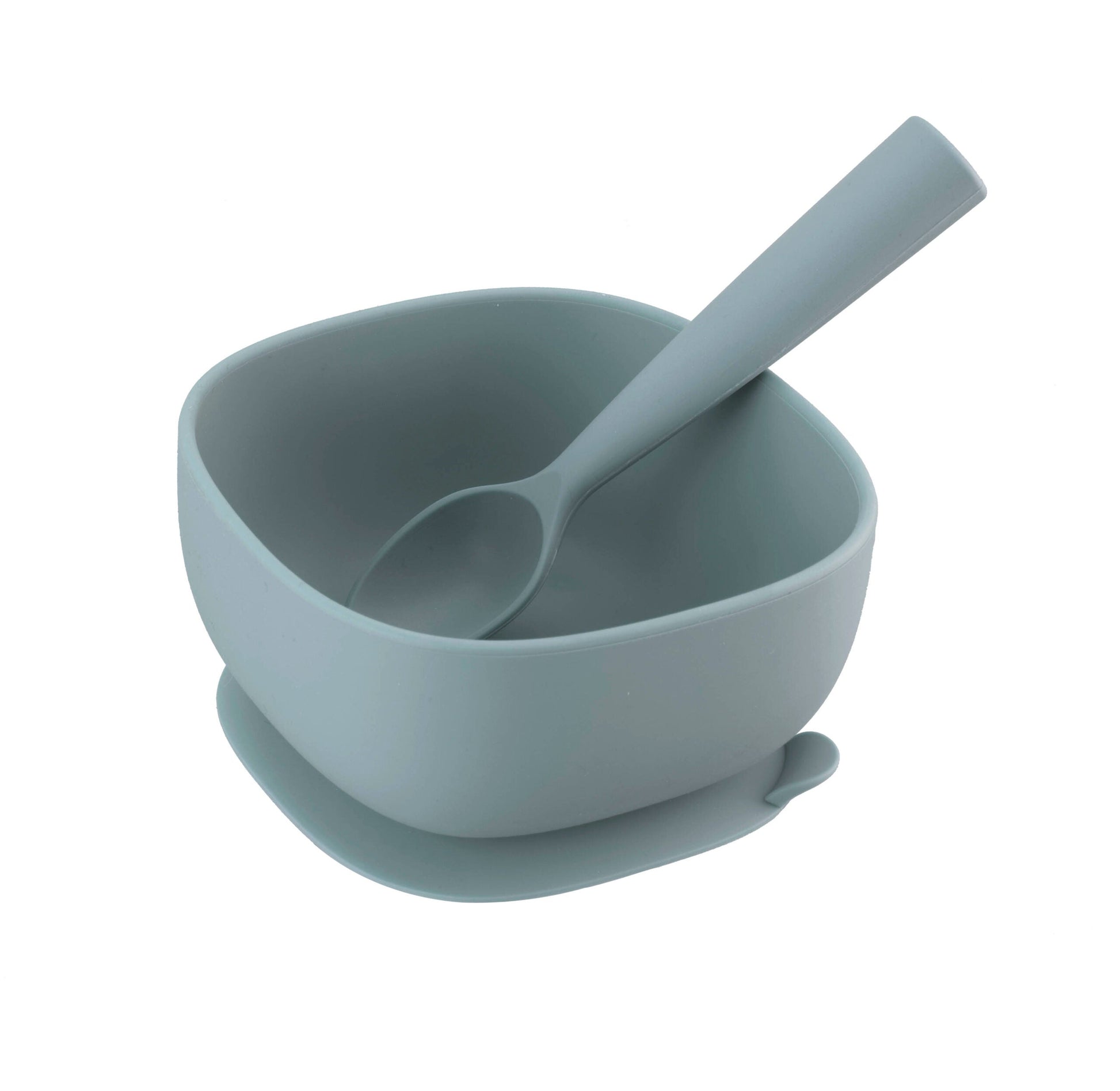Skál og skeið úr sílikoni í grábláum lit.
